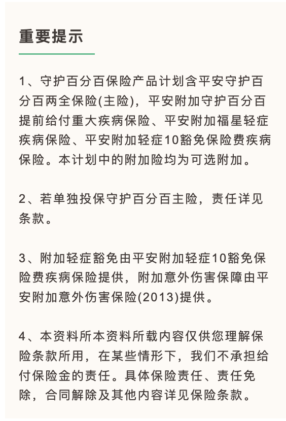 在此,給大家推薦一款保障疾病風(fēng)險(xiǎn)的產(chǎn)品——平安守護(hù)百分百保險(xiǎn)產(chǎn)品計(jì)劃: